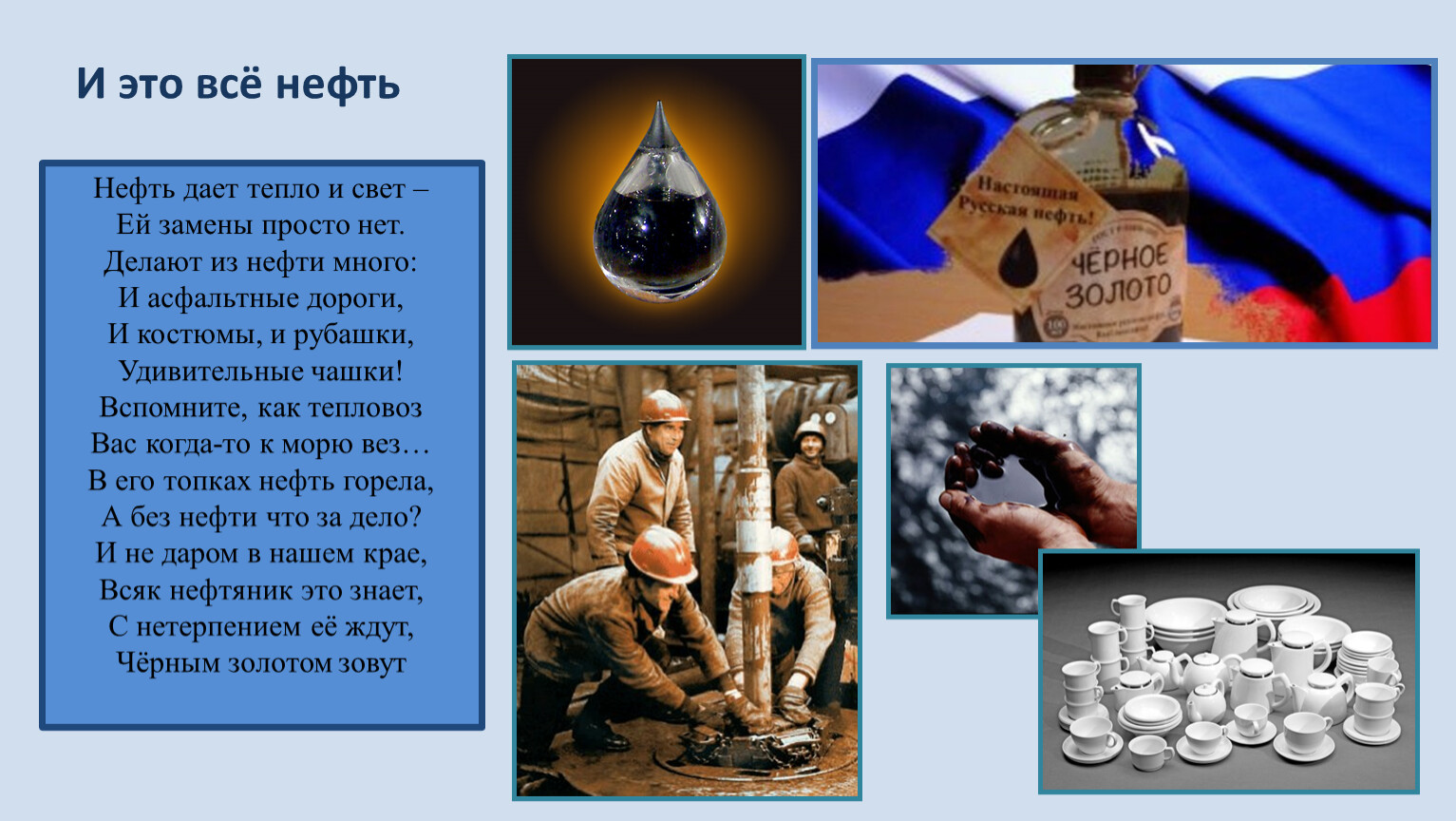 Нефть дает тепло и свет – Ей замены просто нет. Делают из нефти много: И асфальтные дороги, И костюмы, и рубашки, Удивительные чашки! Вспомните, как тепловоз Вас когда-то к морю вез… В его топках нефть горела, А без нефти что за дело? И не даром в нашем крае, Всяк нефтяник это знает, С нетерпением её ждут,Чёрным золотом зовут