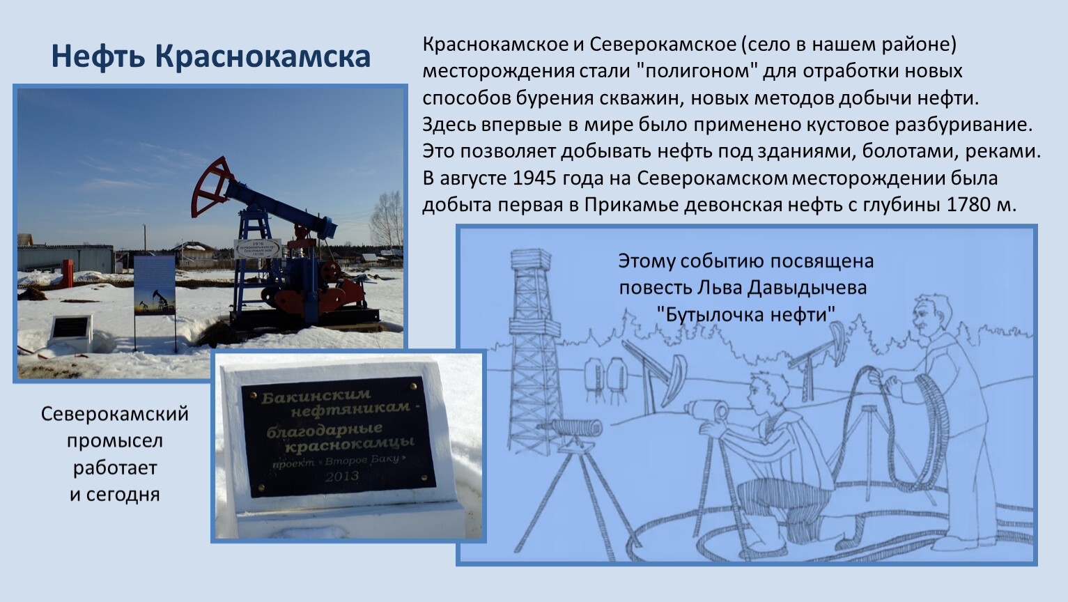 Краснокамское и Северокамское (село в нашем районе) месторождения стали "полигоном" для отработки новых способов бурения скважин, новых методов добычи нефти.Здесь впервые в мире было применено кустовое разбуривание. Это позволяет добывать нефть под зданиями, болотами, реками.