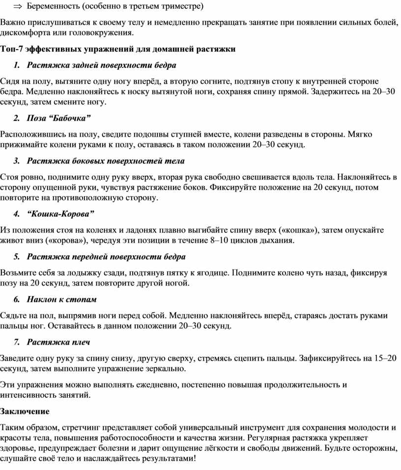 Таким образом, стретчинг представляет собой универсальный инструмент для сохранения молодости и красоты тела, повышения работоспособности и качества жизни. Регулярная растяжка укрепляет здоровье, предупреждает болезни и дарит ощущение лёгкости и свободы движений. Будьте осторожны, слушайте своё тело и наслаждайтесь результатами!
