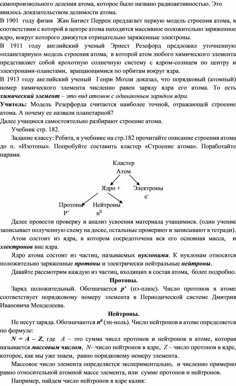 Задание классу: Ребята, в учебнике на стр.182 прочитайте описание строения атома до п. «Изотопы». Попробуйте составить кластер «Строение атома». Поработайте парами.