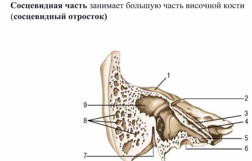 Сосцевидная часть занимает большую часть височной кости (сосцевидный отросток)