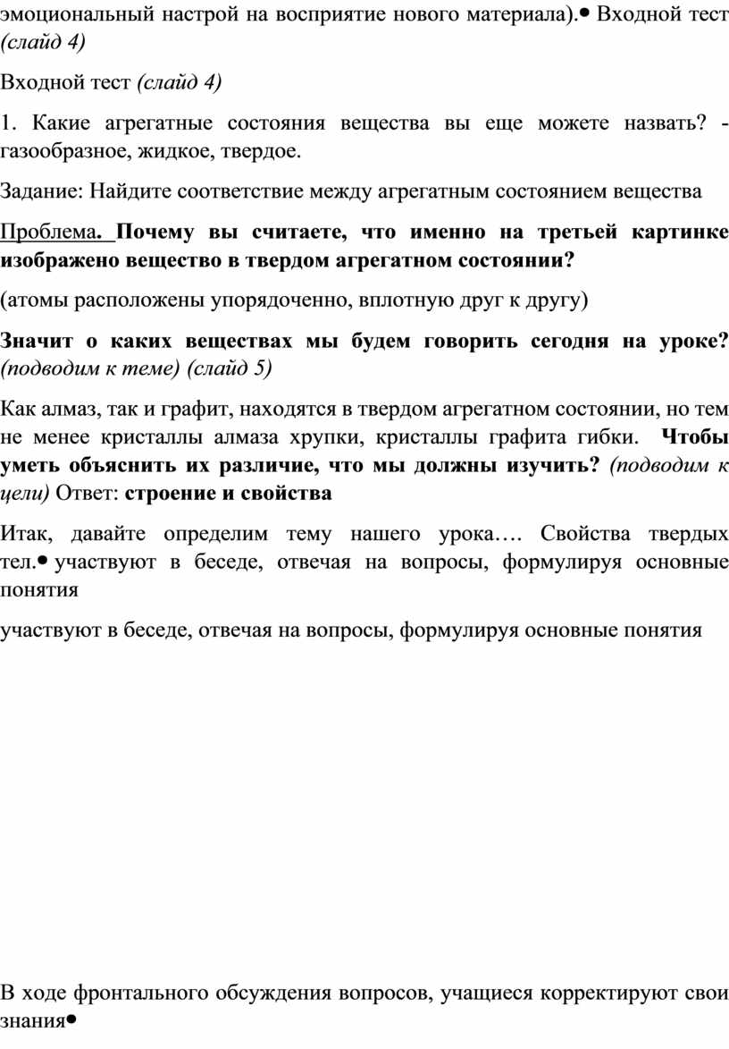 Входной тест (слайд 4) 1. Какие агрегатные состояния вещества вы еще можете назвать? - газообразное, жидкое, твердое. Задание: Найдите соответствие между агрегатным состоянием вещества Проблема. Почему вы считаете, что именно на третьей картинке изображено вещество в твердом агрегатном состоянии? (атомы расположены упорядоченно, вплотную друг к другу) Значит о каких веществах мы будем говорить сегодня на уроке? (подводим к теме) (слайд 5) Как алмаз, так и графит, находятся в твердом агрегатном состоянии, но тем не менее кристаллы алмаза хрупки, кристаллы графита гибки. Чтобы уметь объяснить их различие, что мы должны изучить? (подводим к цели) Ответ: строение и свойства Итак, давайте определим тему нашего урока…. Свойства твердых тел. |