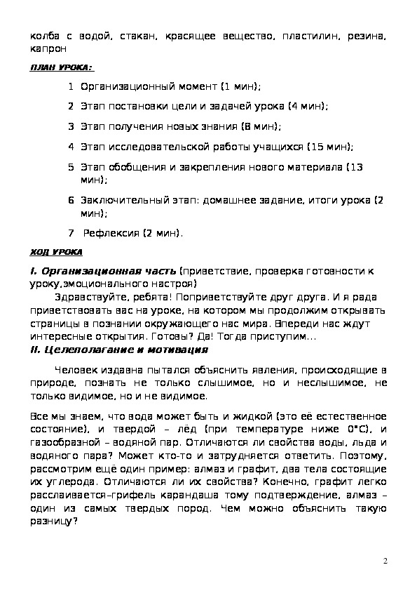 парте учащихся: металлическая проволока, тетрадные листы,колба с водой, стакан, красящее вещество, пластилин, резина,
