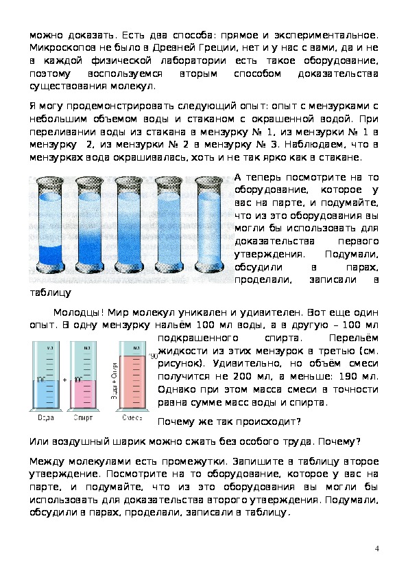 переливании воды из стакана в мензурку № 1, из мензурки № 1 в