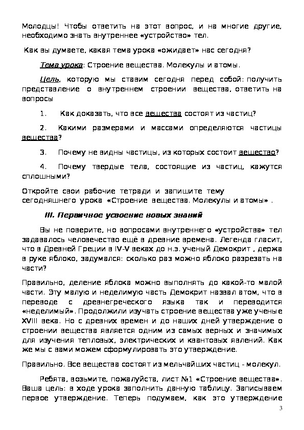 Цель урока: Рассмотрение вопросов строения вещества, строения молекул, формирование объективной необходимости изучения нового материала.