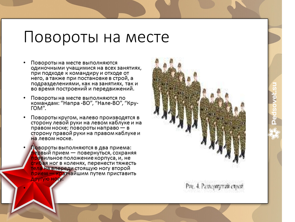Повороты на месте выполняются по командам: “Напра -ВО”, “Нале-ВО”, “Кру-ГОМ”.