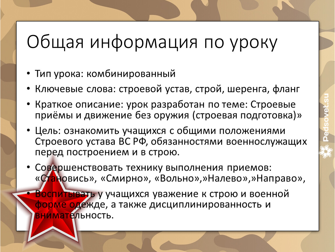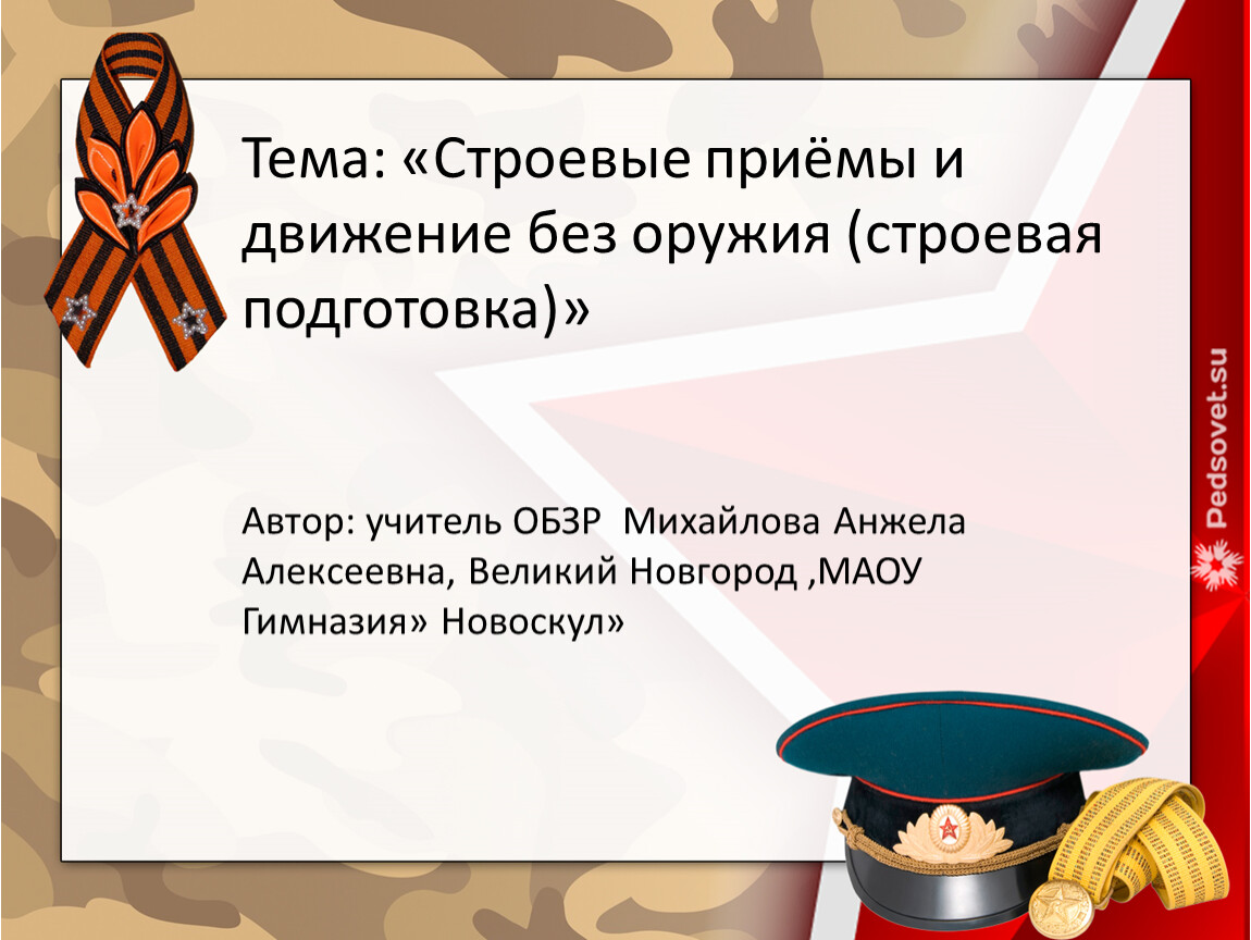 Краткое описание: урок разработан по теме: Строевые приёмы и движение без оружия (строевая подготовка)»