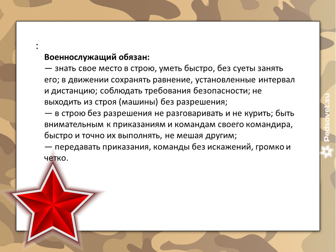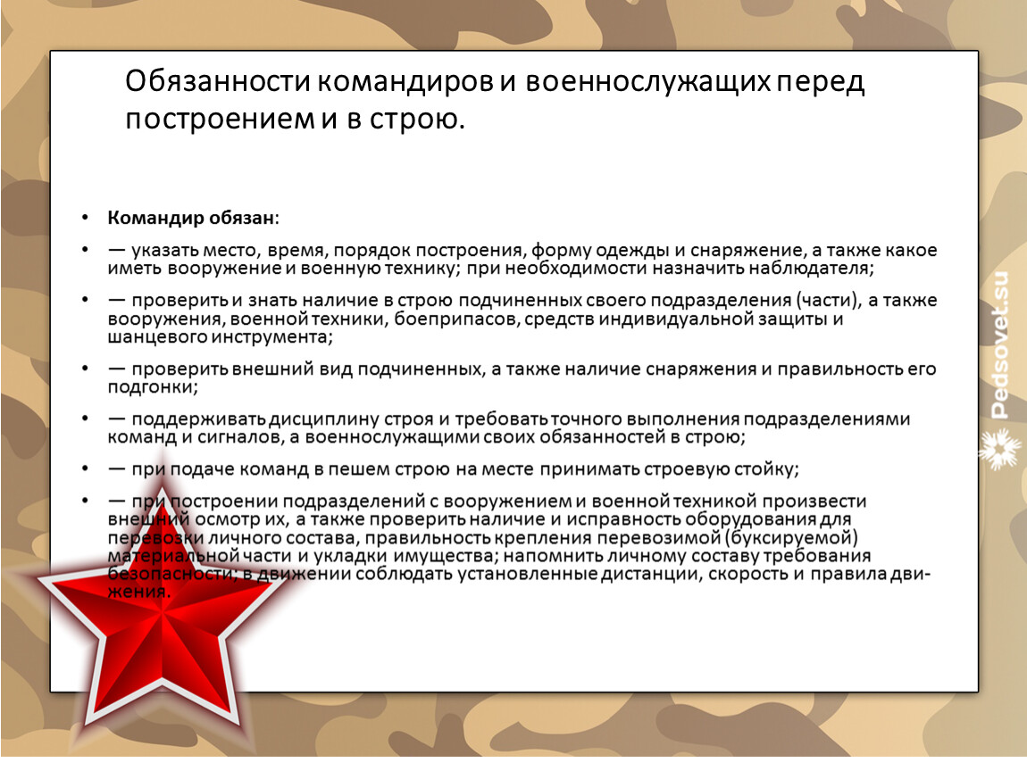 Обязанности командиров и военнослужащих перед построением и в строю.