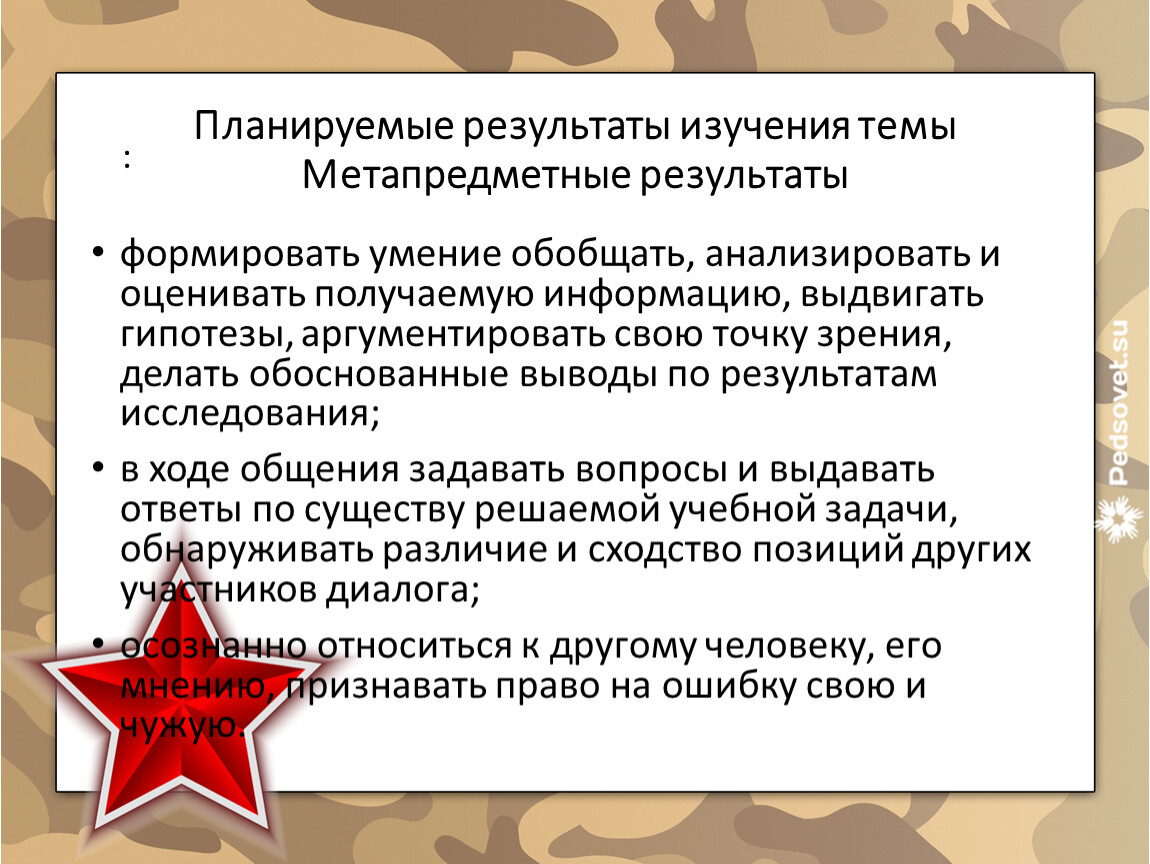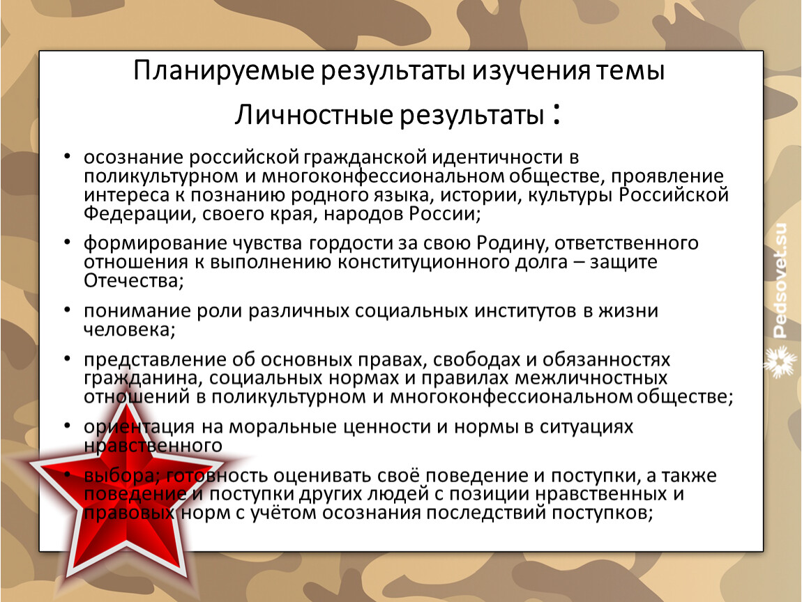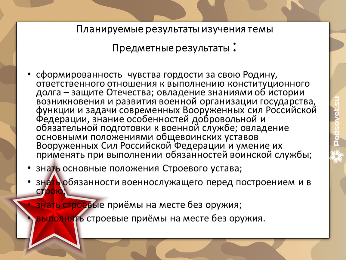 сформированность чувства гордости за свою Родину, ответственного отношения к выполнению конституционного долга – защите Отечества; овладение знаниями об истории возникновения и развития военной организации государства, функции и задачи современных Вооруженных сил Российской Федерации, знание особенностей добровольной и обязательной подготовки к военной службе; овладение основными положениями общевоинских уставов Вооруженных Сил Российской Федерации и умение их применять при выполнении обязанностей воинской службы;