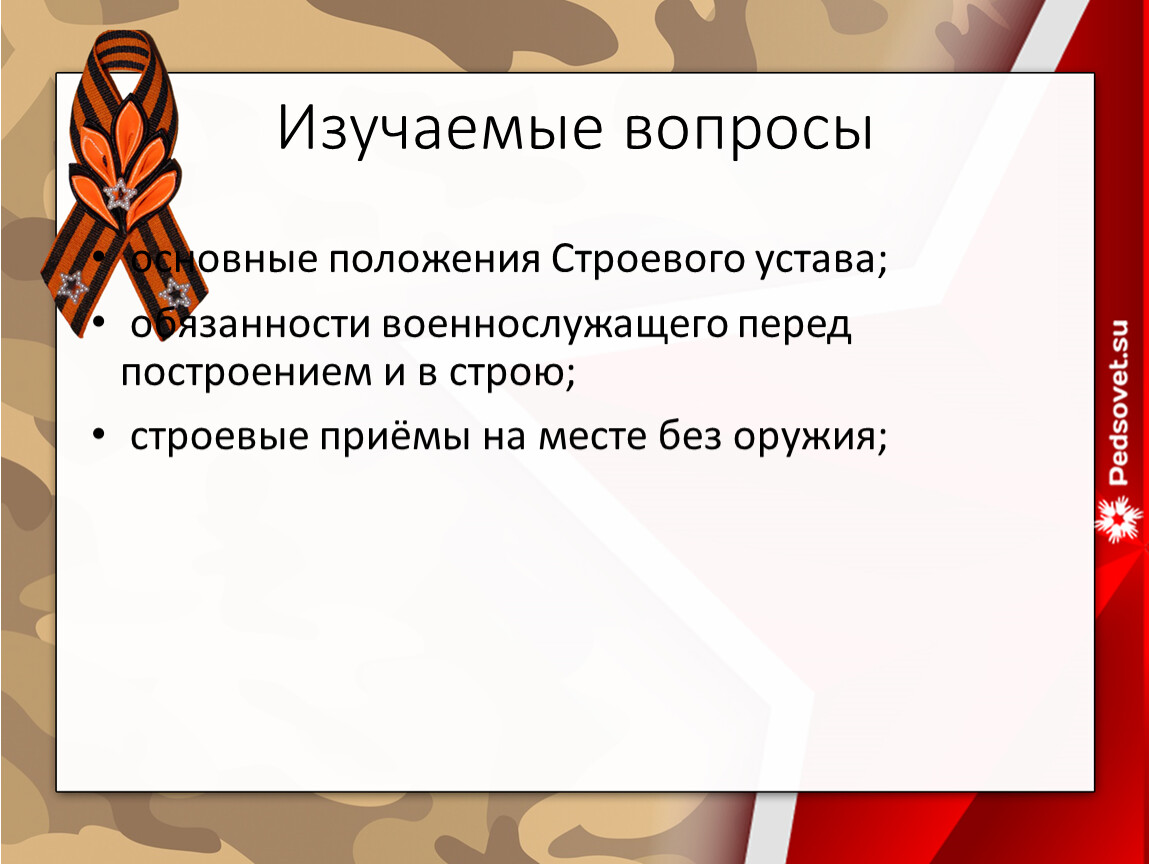 Цель: ознакомить учащихся с общими положениями Строевого устава ВС РФ, обязанностями военнослужащих перед построением и в строю.
