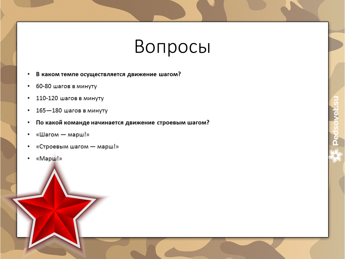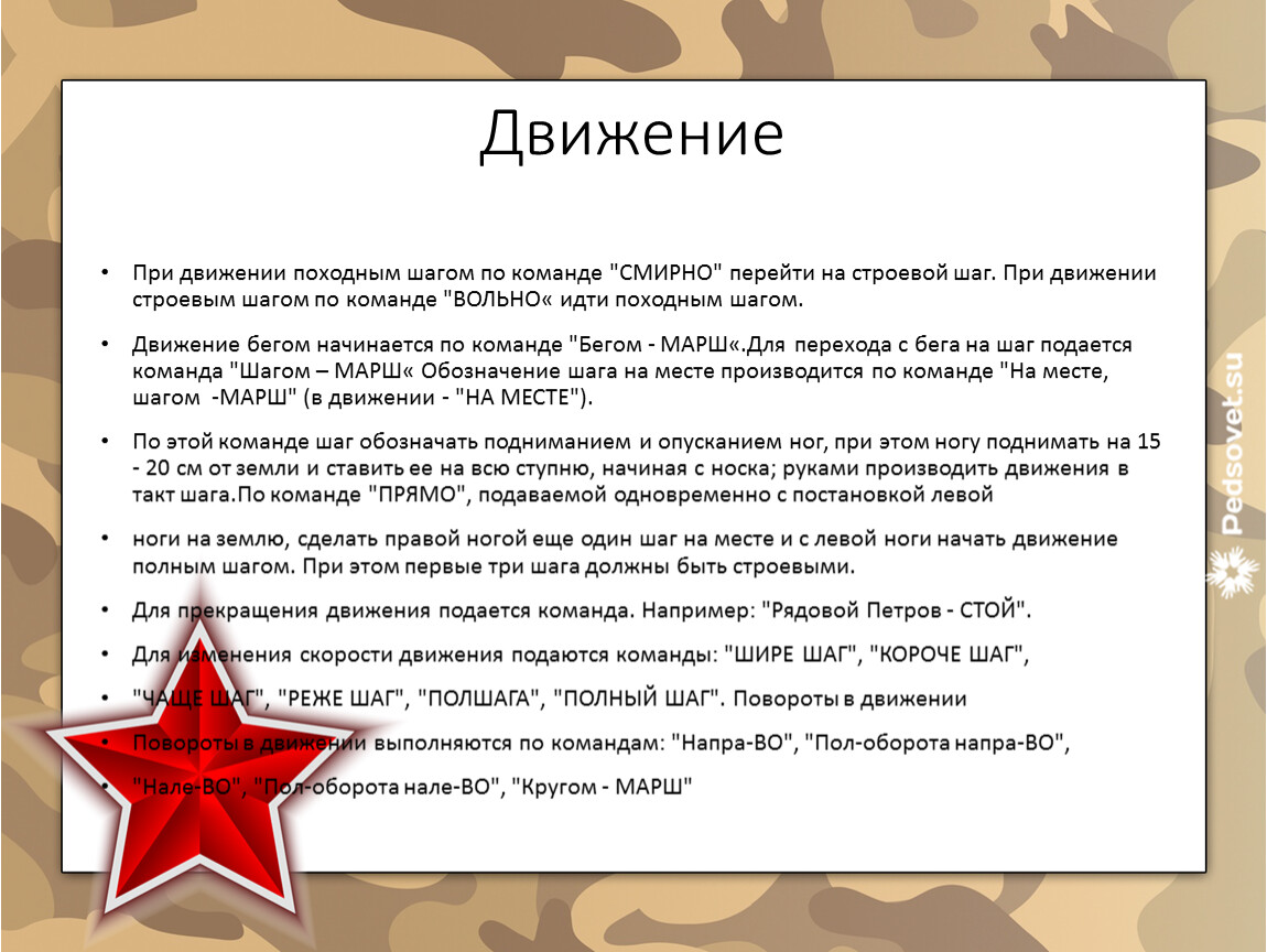 При движении походным шагом по команде "СМИРНО" перейти на строевой шаг. При движении строевым шагом по команде "ВОЛЬНО« идти походным шагом.