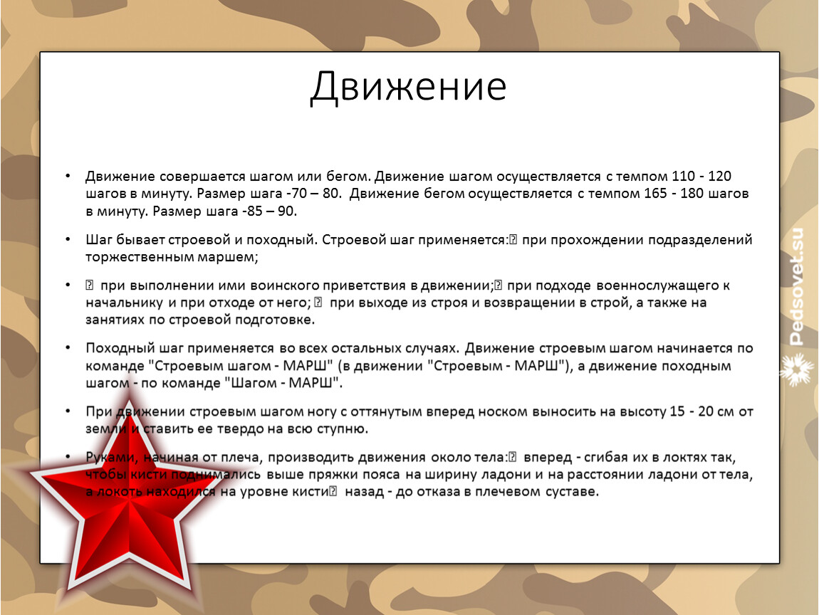 Движение совершается шагом или бегом. Движение шагом осуществляется с темпом 110 - 120 шагов в минуту. Размер шага -70 – 80. Движение бегом осуществляется с темпом 165 - 180 шагов в минуту. Размер шага -85 – 90.