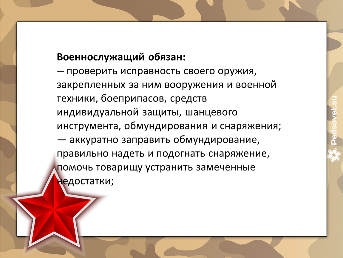 — проверить и знать наличие в строю подчиненных своего подразделения (части), а также вооружения, военной техники, боеприпасов, средств индивидуальной защиты и шанцевого инструмента;