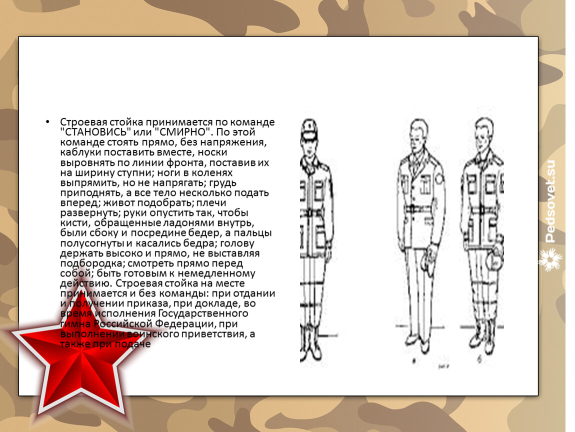 Строевая стойка принимается по команде "СТАНОВИСЬ" или "СМИРНО". По этой команде стоять прямо, без напряжения, каблуки поставить вместе, носки выровнять по линии фронта, поставив их на ширину ступни; ноги в коленях выпрямить, но не напрягать; грудь приподнять, а все тело несколько подать вперед; живот подобрать; плечи развернуть; руки опустить так, чтобы кисти, обращенные ладонями внутрь, были сбоку и посредине бедер, а пальцы полусогнуты и касались бедра; голову держать высоко и прямо, не выставляя подбородка; смотреть прямо перед собой; быть готовым к немедленному действию. Строевая стойка на месте принимается и без команды: при отдании и получении приказа, при докладе, во время исполнения Государственного гимна Российской Федерации, при выполнении воинского приветствия, а также при подаче
