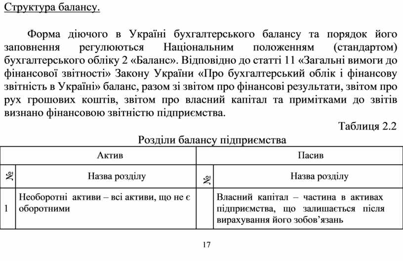 Актив балансу складається з трьох розділів, а пасив – з п’яти розділів, у яких згруповано економічно однорідні засоби і джерела так, щоб з найбільшою ясністю простежувався взаємозв’язок між складом господарських засобів в активі та джерелами їх формування в пасиві балансу. Це істотно підвищує пізнавальні якості балансу, полегшує контроль та забезпечує аналіз фінансового стану підприємства.