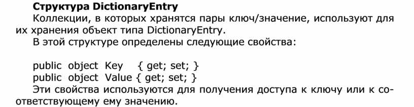 Коллекции, в которых хранятся пары ключ/значение, используют для их хранения объект типа DictionaryEntry.