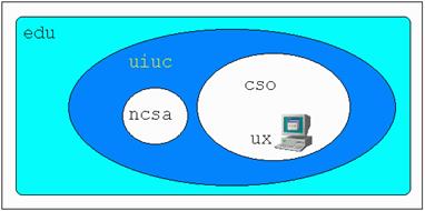 В имени может быть любое число доменов, но более пяти встречается редко. Каждый последующий домен в имени (если смотреть слева направо) больше предыдущего. В имени ux.cso.uiuc.edu элемент ux – имя реального компьютера с IP - адресом. (См. рисунок).
