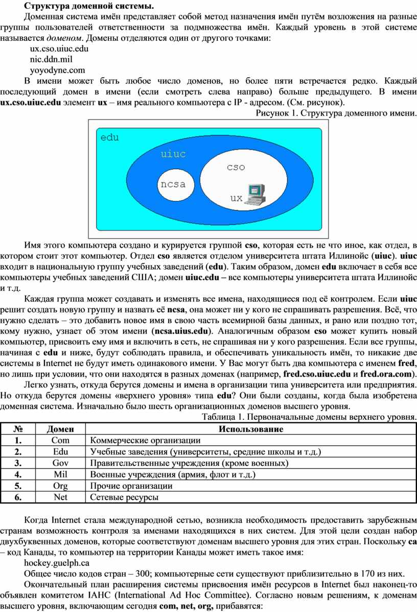 Имя этого компьютера создано и курируется группой cso, которая есть не что иное, как отдел, в котором стоит этот компьютер. Отдел cso является отделом университета штата Иллинойс (uiuc). uiuc входит в национальную группу учебных заведений (edu). Таким образом, домен edu включает в себя все компьютеры учебных заведений США; домен uiuc.edu – все компьютеры университета штата Иллинойс и т.д.