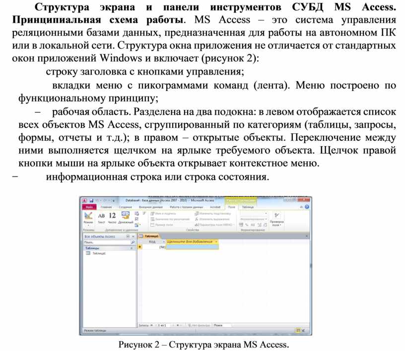 Структура экрана и панели инструментов СУБД MS Access. Принципиальная схема работы. MS Access – это система управления реляционными базами данных, предназначенная для работы на автономном ПК или в локальной сети. Структура окна приложения не отличается от стандартных окон приложений Windows и включает (рисунок 2):