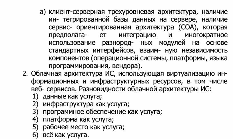 c) клиент-серверная трехуровневая архитектура, наличие ин- тегрированной базы данных на сервере, наличие сервис- ориентированная архитектура (СОА), которая предполага- ет интеграцию и многократное использование разнород- ных модулей на основе стандартных интерфейсов, взаим- ную независимость компонентов (операционной системы, платформы, языка программирования, вендора).