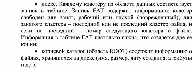· корневой каталог (область ROOT) содержит информацию о файлах, хранящихся на диске (имя, размер, дату создания, атрибуты и др.).
