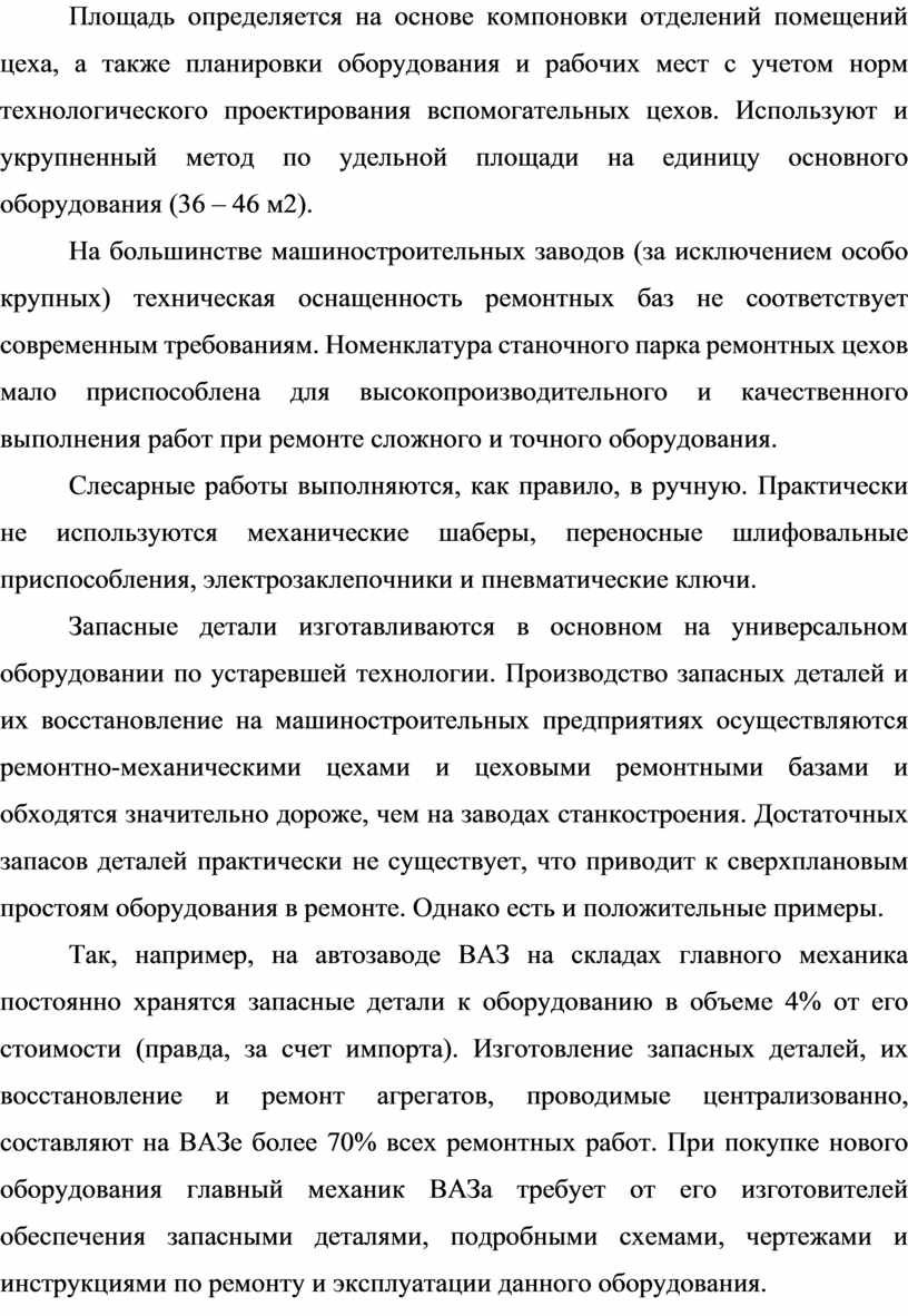 На большинстве машиностроительных заводов (за исключением особо крупных) техническая оснащенность ремонтных баз не соответствует современным требованиям. Номенклатура станочного парка ремонтных цехов мало приспособлена для высокопроизводительного и качественного выполнения работ при ремонте сложного и точного оборудования.