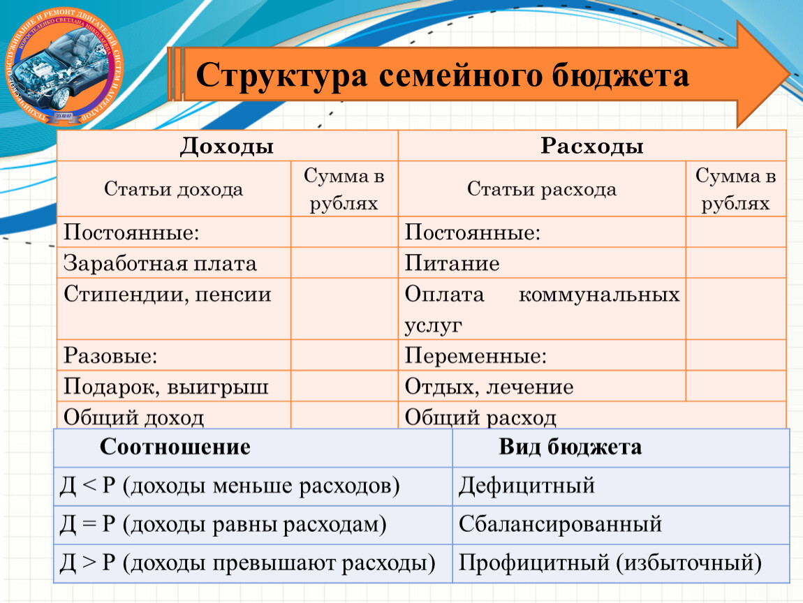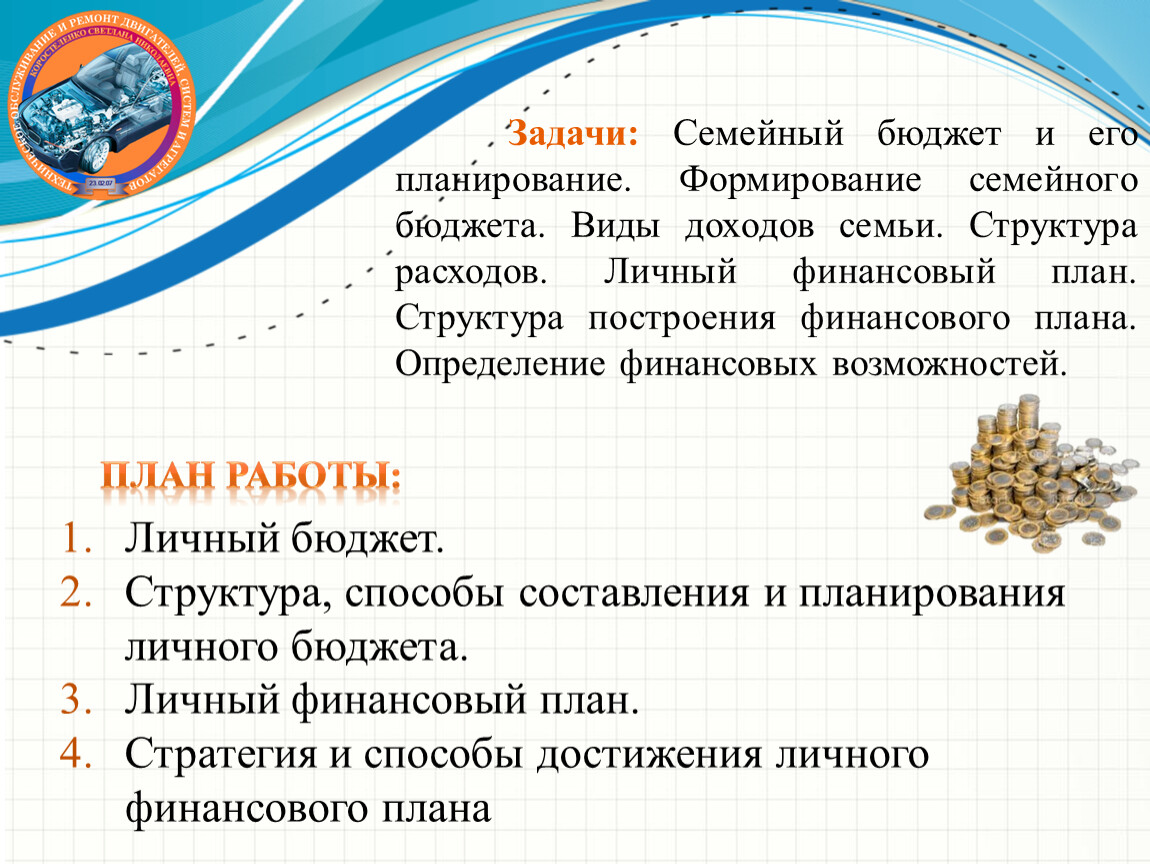 Задачи: Семейный бюджет и его планирование. Формирование семейного бюджета. Виды доходов семьи. Структура расходов. Личный финансовый план. Структура построения финансового плана. Определение финансовых возможностей.
