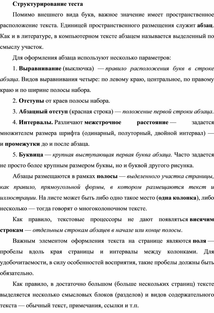 Помимо внешнего вида букв, важное значение имеет пространственное расположение текста. Единицей пространственного размещения служит абзац. Как и в литературе, в компьютерном тексте абзацем называется выделенный по смыслу участок.