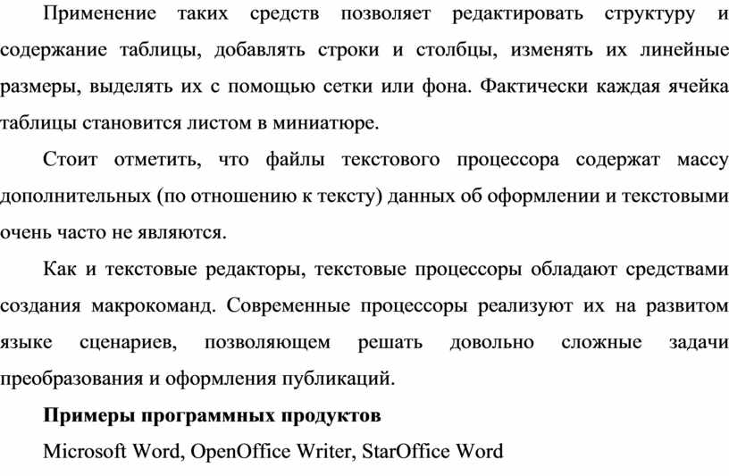Как и текстовые редакторы, текстовые процессоры обладают средствами создания макрокоманд. Современные процессоры реализуют их на развитом языке сценариев, позволяющем решать довольно сложные задачи преобразования и оформления публикаций.