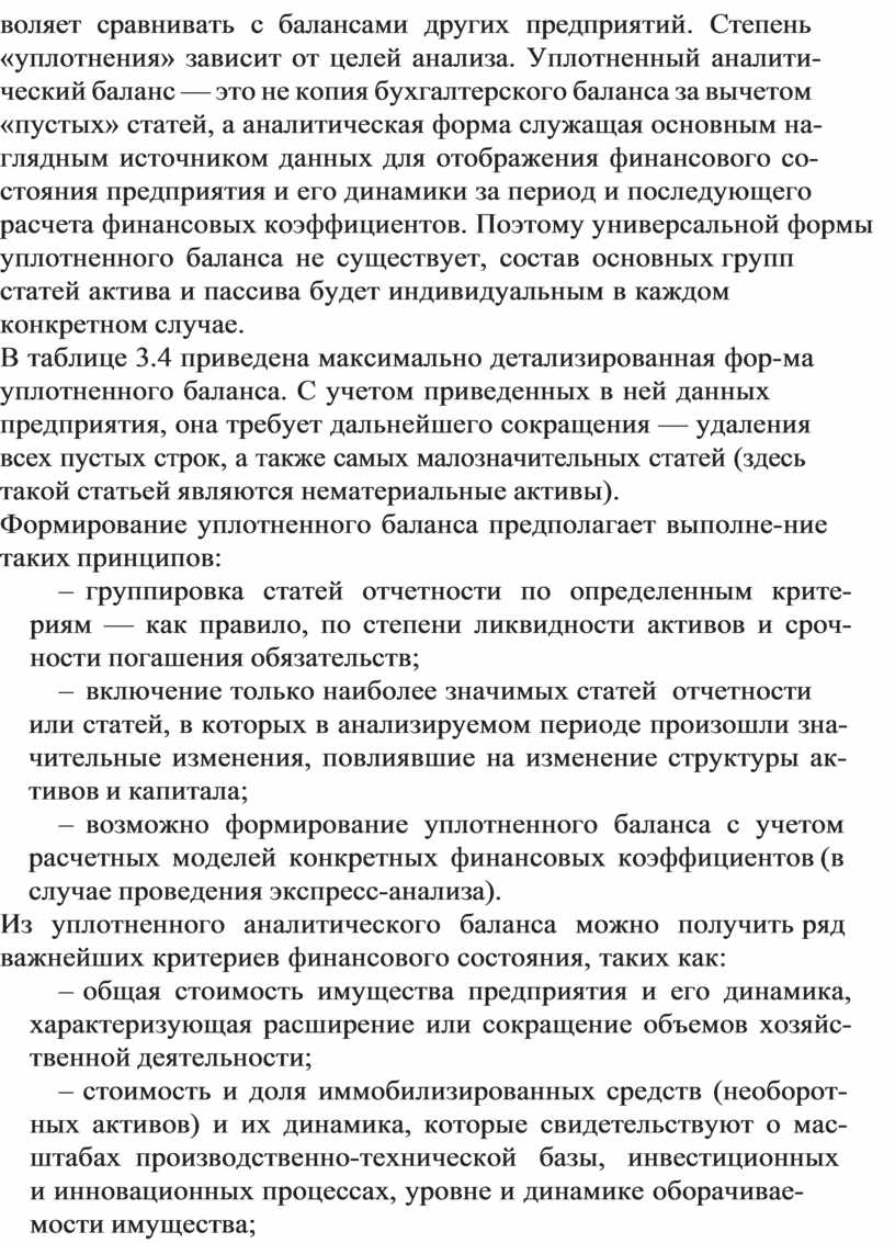 В таблице 3.4 приведена максимально детализированная фор- ма уплотненного баланса. С учетом приведенных в ней данных предприятия, она требует дальнейшего сокращения — удаления всех пустых строк, а также самых малозначительных статей (здесь такой статьей являются нематериальные активы).
