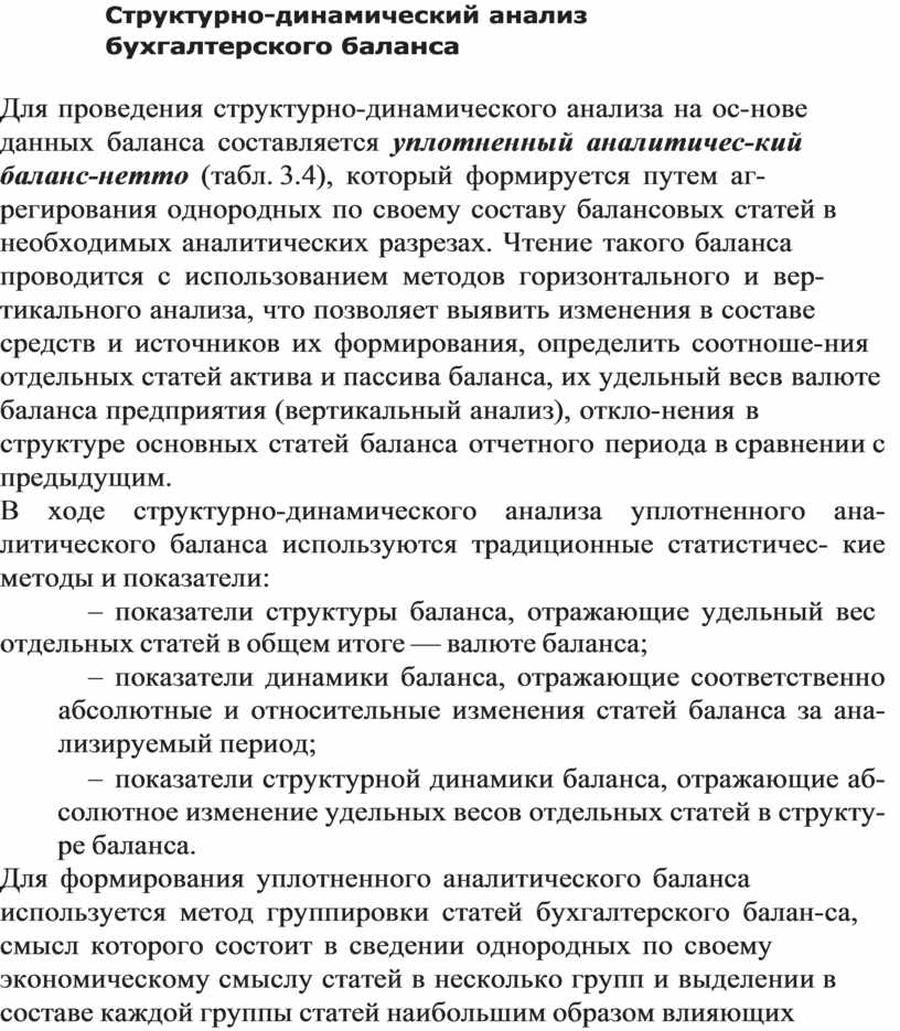 Для проведения структурно-динамического анализа на ос- нове данных баланса составляется уплотненный аналитичес- кий баланс-нетто (табл. 3.4), который формируется путем аг- регирования однородных по своему составу балансовых статей в необходимых аналитических разрезах. Чтение такого баланса проводится с использованием методов горизонтального и вер- тикального анализа, что позволяет выявить изменения в составе средств и источников их формирования, определить соотноше- ния отдельных статей актива и пассива баланса, их удельный вес в валюте баланса предприятия (вертикальный анализ), откло- нения в структуре основных статей баланса отчетного периода в сравнении с предыдущим.