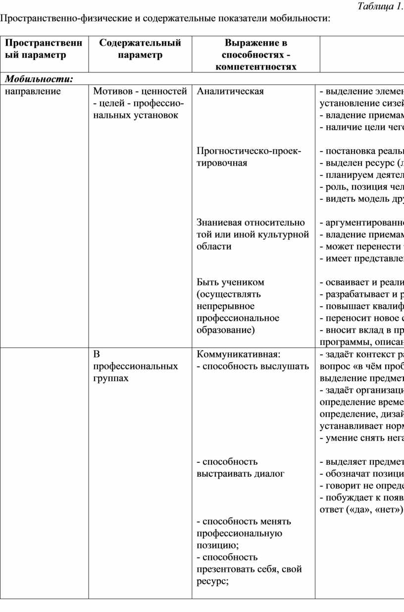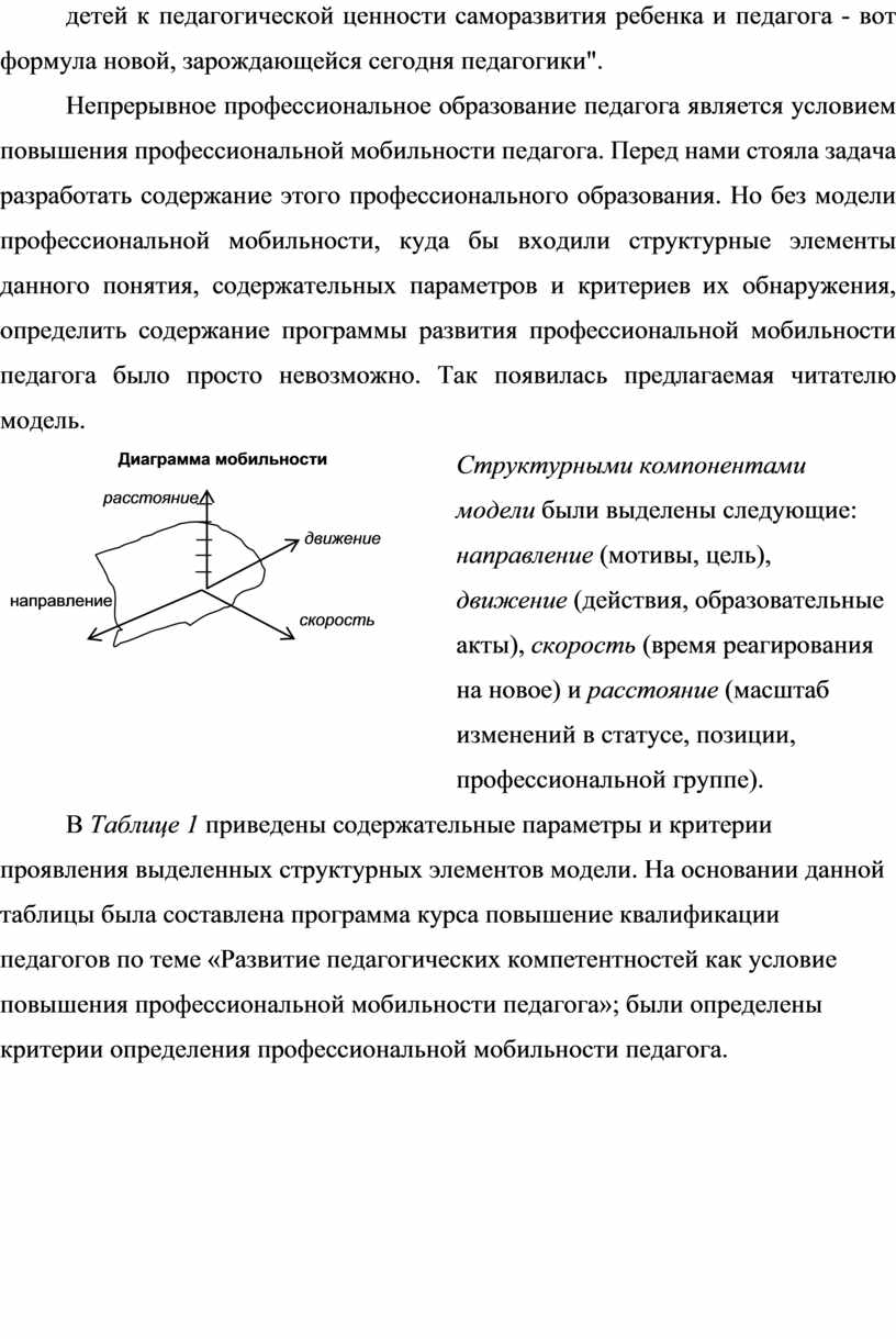 В Таблице 1 приведены содержательные параметры и критерии проявления выделенных структурных элементов модели. На основании данной таблицы была составлена программа курса повышение квалификации педагогов по теме «Развитие педагогических компетентностей как условие повышения профессиональной мобильности педагога»; были определены критерии определения профессиональной мобильности педагога.