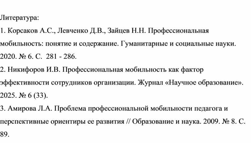 2. Никифоров И.В. Профессиональная мобильность как фактор эффективности сотрудников организации. Журнал «Научное образование». 2025. № 6 (33).