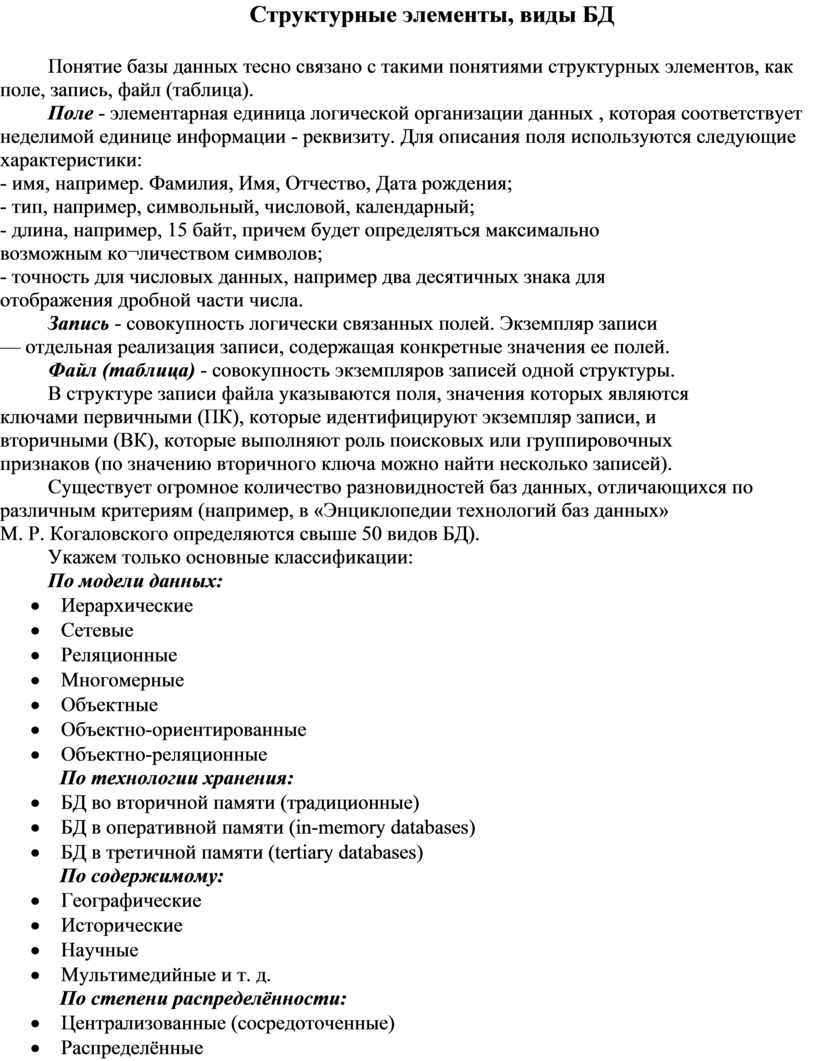 Структурные элементы, виды БД