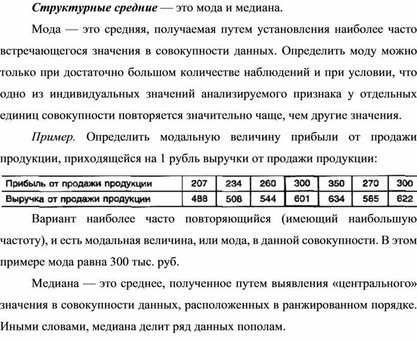 Вариант наиболее часто повторяющийся (имеющий наибольшую частоту), и есть модальная величина, или мода, в данной совокупности. В этом примере мода равна 300 тыс. руб.