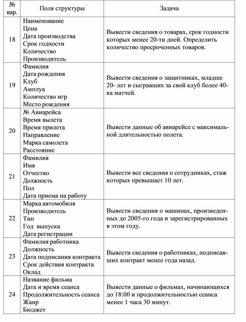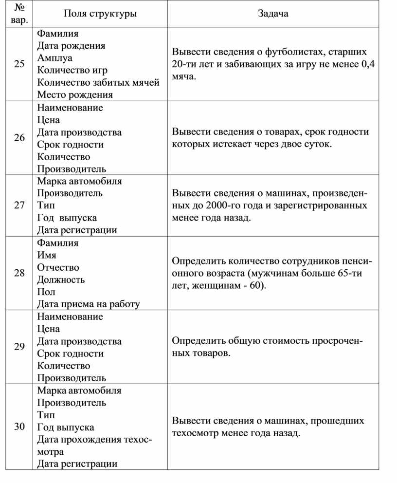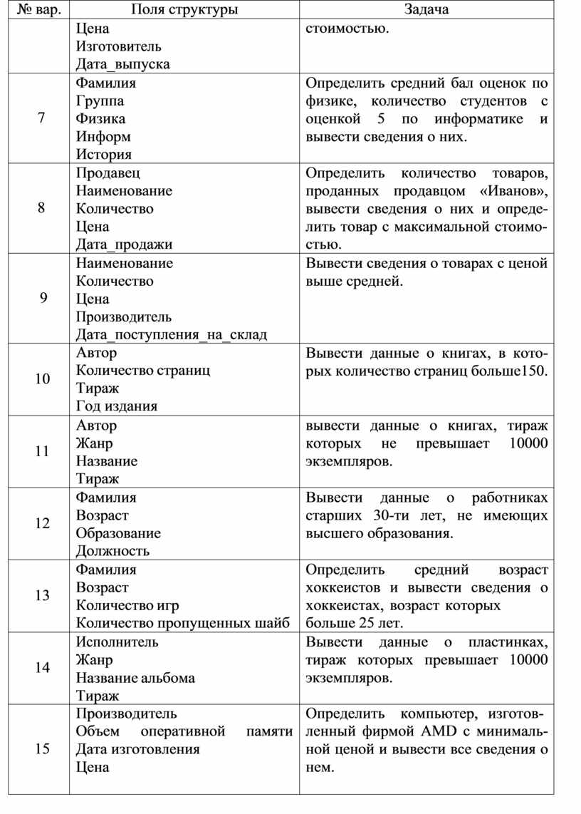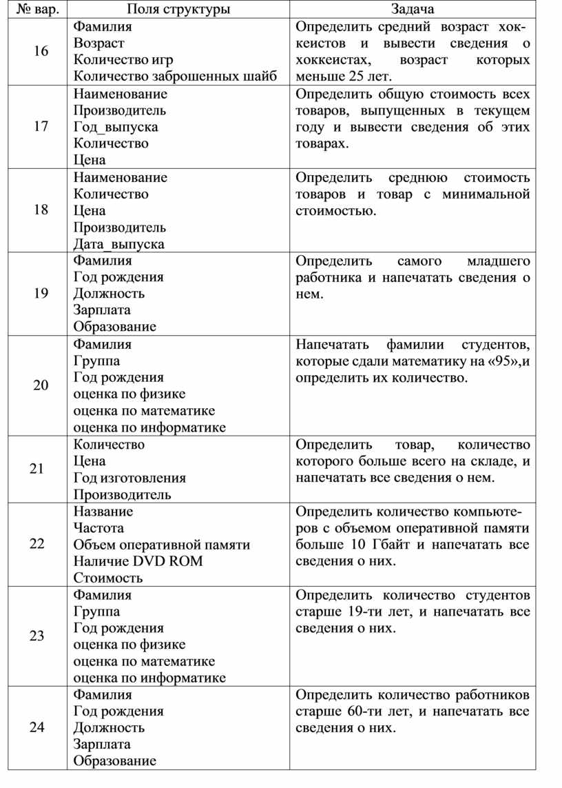 Описать структуру с именем TOVAR, содержащую поля: - название товара; количество единиц товара; стоимость товара; дата поступления товара в виде структуры (год, месяц, день). Написать функции: - создания массива SPISOK не более чем из 10 записей (структур) данных о товарах (ввод данных с клавиатуры); - вычисления средней стоимости товара; - расположения записей по возрастанию стоимости товаров; - вывода сведений о товарах, поступивших более 10 месяцев назад. Все необходимые данные для функций должны передаваться в каче- стве их параметров. Использование глобальных параметров не допуска- ется. Создать проект, который демонстрирует работу всех функций. |