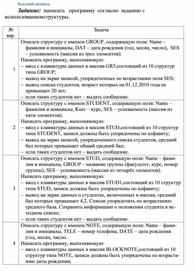 Описать структуру с именем STUD, содержащую поля: Name – фами- лия и инициалы, GROUP – название группы (факультет, курс, номер группы), SES – успеваемость (массив из четырёх элементов). Написать программу, выполняющую: - ввод с клавиатуры данных в массив STUD1,состоящий из 10 структур типа STUD, записи должны быть упорядочены по алфавиту; - вывод на экран данных о студентах, включенных в массив, средний бал которых превышает 4,2. Список упорядочить по возрастанию среднего бала. Сохранить информацию о положении студента в ис- ходном списке; - если таких студентов нет – выдать сообщение. |
