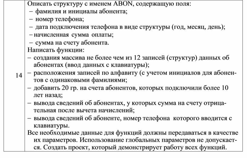 Описать структуру с именем ABON, содержащую поля: - фамилия и инициалы абонента; - номер телефона; - дата подключения телефона в виде структуры (год, месяц, день); - начисленная сумма оплаты; - сумма на счету абонента. Написать функции: - создания массива не более чем из 12 записей (структур) данных об абонентах (ввод данных с клавиатуры); - расположения записей по алфавиту (с учетом инициалов для абонен- тов с одинаковыми фамилиями; - добавить 20 гр. на счета абонентов, которых подключили более 10 лет назад; - вывода сведений об абонентах, у которых сумма на счету отрица- тельная после вычета начислений; - вывода сведений об абоненте, номер телефона которого вводится с клавиатуры. Все необходимые данные для функций должны передаваться в качестве их параметров. Использование глобальных параметров не допускает- ся. Создать проект, который демонстрирует работу всех функций. |