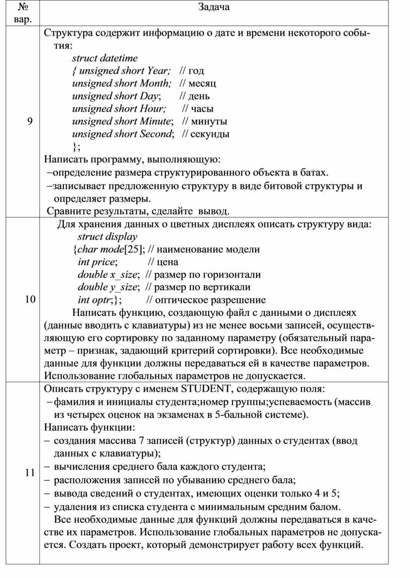 Структура содержит информацию о дате и времени некоторого собы- тия: struct datetime { unsigned short Year; // год unsigned short Month; // месяц unsigned short Day; // день unsigned short Hour; // часы unsigned short Minute; // минуты unsigned short Second; // секунды }; Написать программу, выполняющую: -определение размера структурированного объекта в батах. -записывает предложенную структуру в виде битовой структуры и определяет размеры. Сравните результаты, сделайте вывод. |