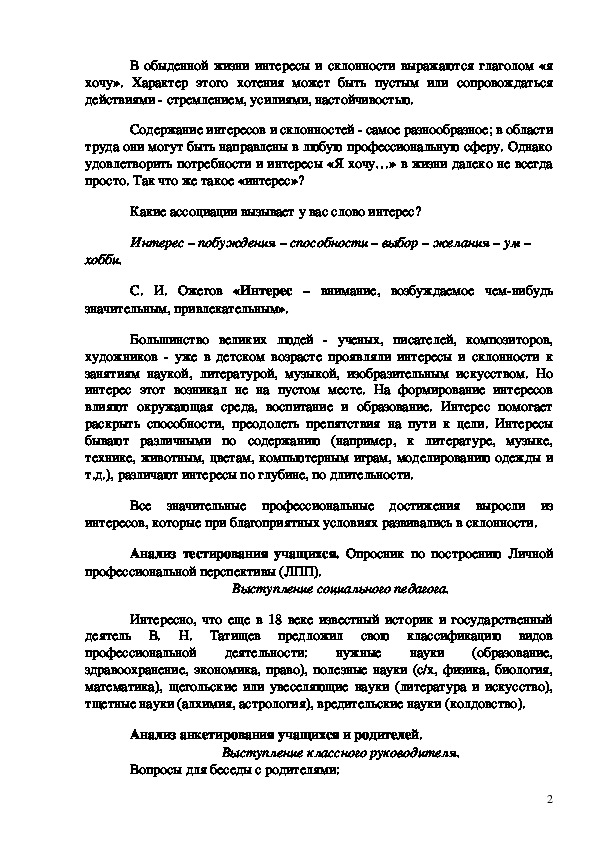 жизни, сознательного подхода к выбору профессиональной деятельности, а