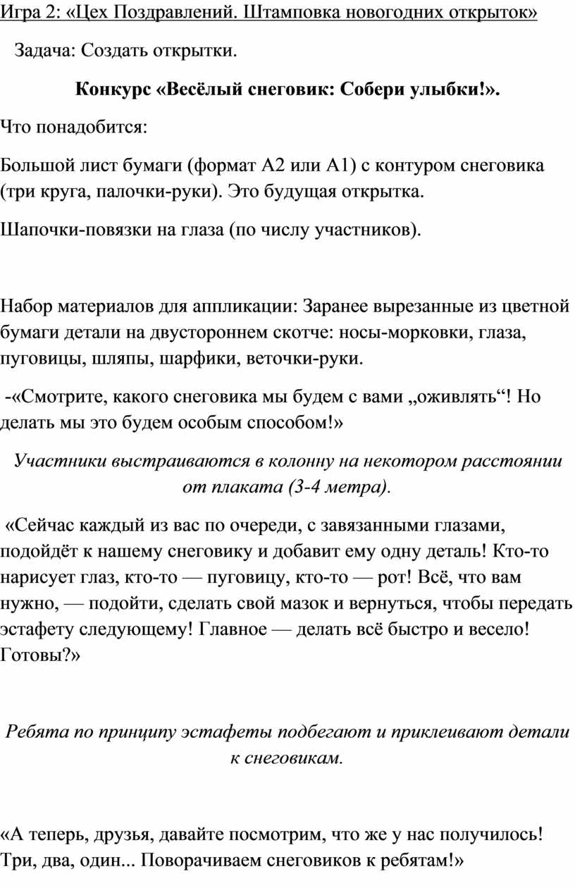 «Сейчас каждый из вас по очереди, с завязанными глазами, подойдёт к нашему снеговику и добавит ему одну деталь! Кто-то нарисует глаз, кто-то — пуговицу, кто-то — рот! Всё, что вам нужно, — подойти, сделать свой мазок и вернуться, чтобы передать эстафету следующему! Главное — делать всё быстро и весело! Готовы?»