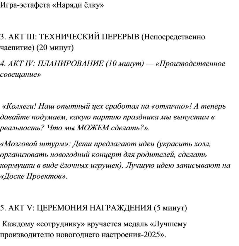 - «Дорогие сотрудники завода! Наш совет — не просто группа активистов. Мы — фабрика, которая производит самое ценное в декабре — Новогоднее Настроение! Но сырье для него — не дерево и не металл. Наше сырье — это Добрые Дела и Совместное Творчество! Сегодня мы должны запустить главный конвейер и изготовить партию праздника для своих близких!»