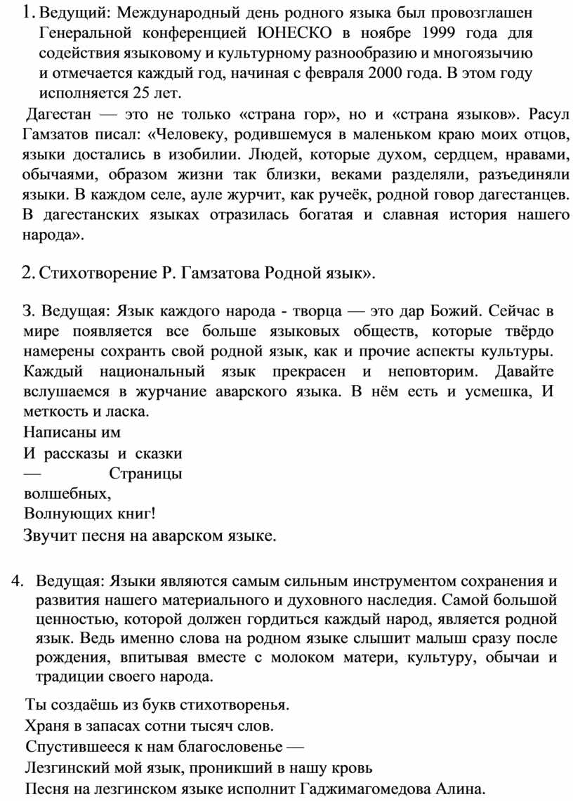 1. Ведущий: Международный день родного языка был провозглашен Генеральной конференцией ЮНЕСКО в ноябре 1999 года для содействия языковому и культурному разнообразию и многоязычию и отмечается каждый год, начиная с февраля 2000 года. В этом году исполняется 25 лет.