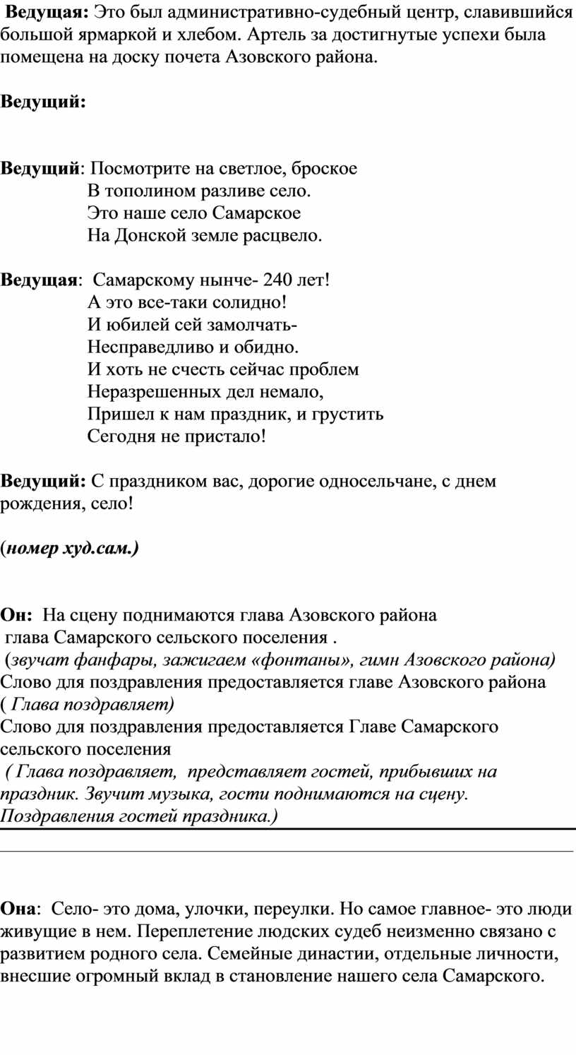 Она: Село- это дома, улочки, переулки. Но самое главное- это люди живущие в нем. Переплетение людских судеб неизменно связано с развитием родного села. Семейные династии, отдельные личности, внесшие огромный вклад в становление нашего села Самарского.