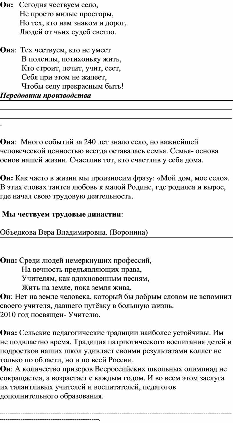 Он: Как часто в жизни мы произносим фразу: «Мой дом, мое село». В этих словах таится любовь к малой Родине, где родился и вырос, где начал свою трудовую деятельность.