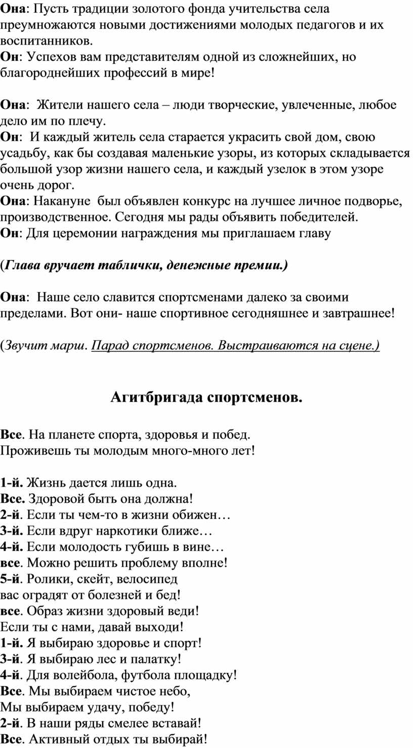 Она: Наше село славится спортсменами далеко за своими пределами. Вот они- наше спортивное сегодняшнее и завтрашнее!