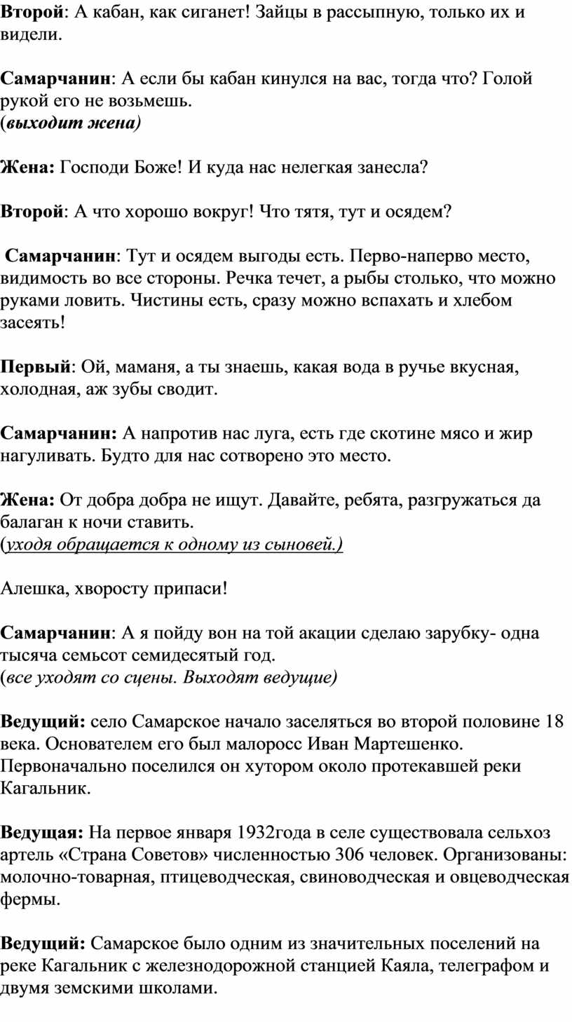 Ведущий: село Самарское начало заселяться во второй половине 18 века. Основателем его был малоросс Иван Мартешенко. Первоначально поселился он хутором около протекавшей реки Кагальник.