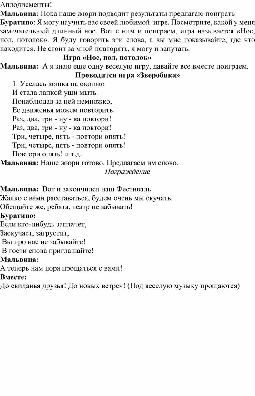 Мальвина: Добрый вечер, уважаемые дети и взрослые. Мы с Буратино слышали, что у вас сегодня фестиваль. Но не простой, а театральный. Интересно, а вы знаете, где находится дверь в мир театра?