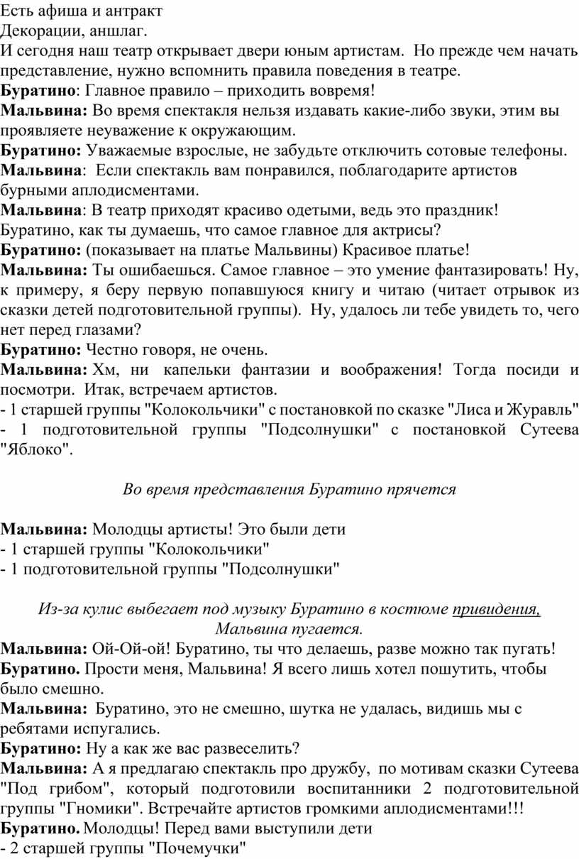 Мальвина: А я предлагаю спектакль про дружбу, по мотивам сказки Сутеева "Под грибом", который подготовили воспитанники 2 подготовительной группы "Гномики". Встречайте артистов громкими аплодисментами!!!