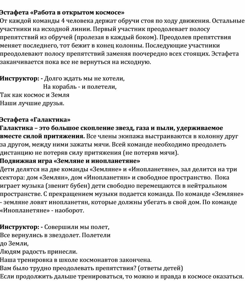 Инструктор: Мы с вами живем на самой красивой планете. Кто знает, как называется наша планета? (Земля) Глядя на небо, люди всегда хотели узнать, обитаемы ли другие планеты в космосе. Для этого они построили космические корабли (звездолеты) и на них стали совершать полеты в космос. Кто мне скажет, как звали первого человека, полетевшего в космос? (Юрий Гагарин) Чтобы стать космонавтом надо много знать, уметь и быть в отличной физической форме, т.е. много тренироваться. Этому учат в школе космонавтов. А, сейчас я проверю, что вы знаете о космосе: